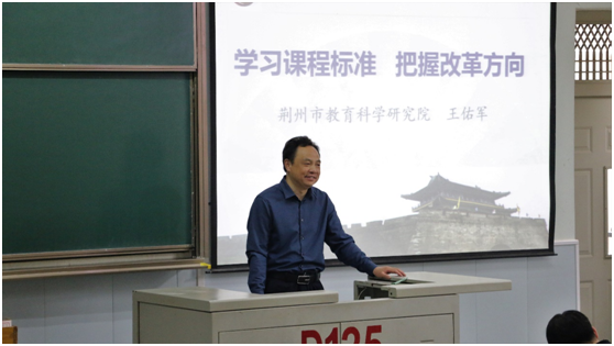 据悉,王佑军老师是荆州市教科院总支书记、院长,教育部教学指导委员会委员、湖北省政府督学、湖北省特级教师、正高级教师、湖北名师、vkgame电竞官网硕士生导师。在全国中文核心期刊发表文章60余篇,著有《敲开作文教学的果壳》、《写作教学的智慧》、《站在学生的角度教语文》等著作。先后主持完成省级重点课题2项,人教社委托专项研究课题4项,中央电教馆委托专项研究课题1项,目前承担湖北省教育厅重点招标课题1项。作为中学语文名师进大学课堂的活动之一,王老师不仅将中学示范课堂带到大学课堂,还具体介绍了新课标改革历程中的发展趋势,扩大了我们师生的视野。